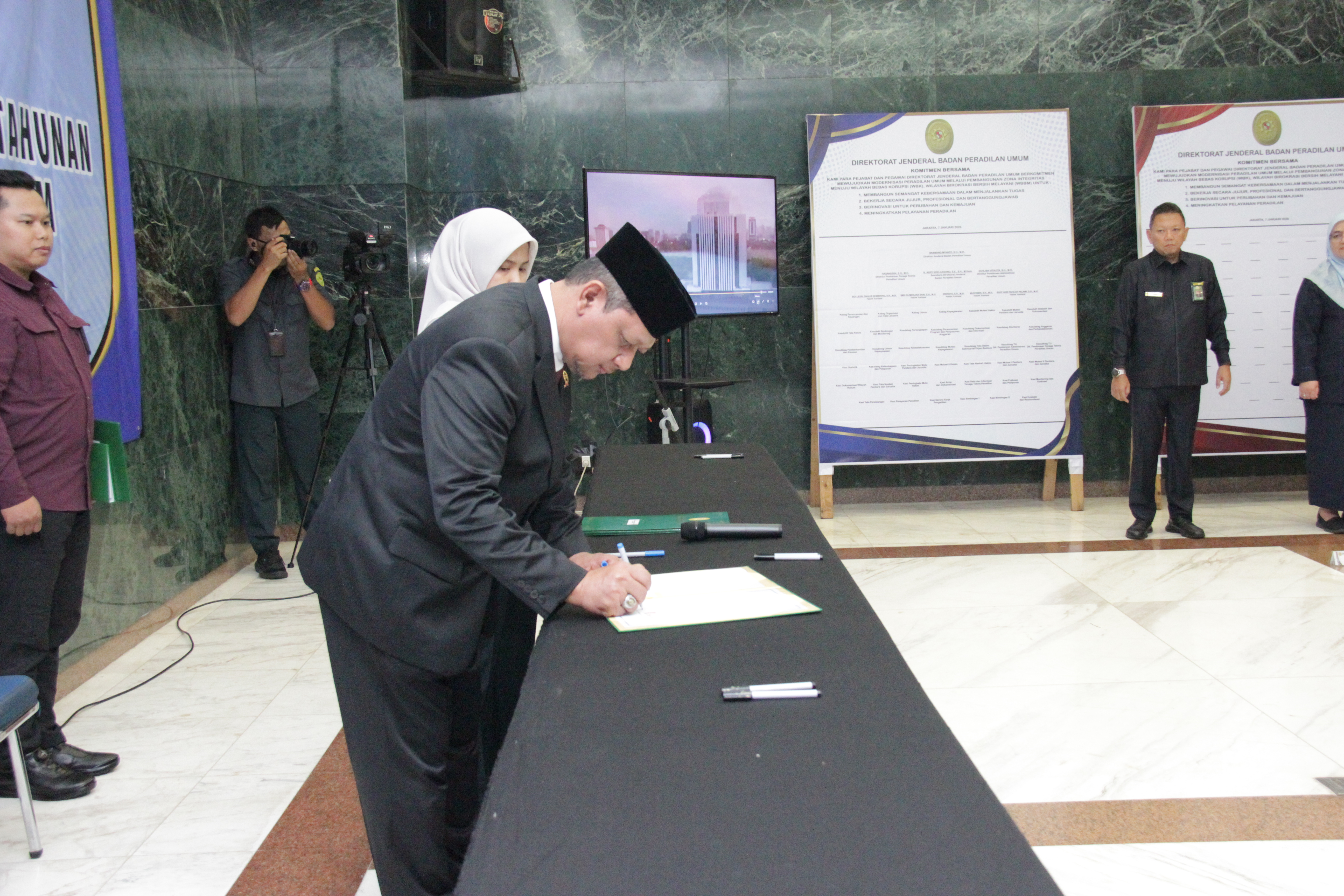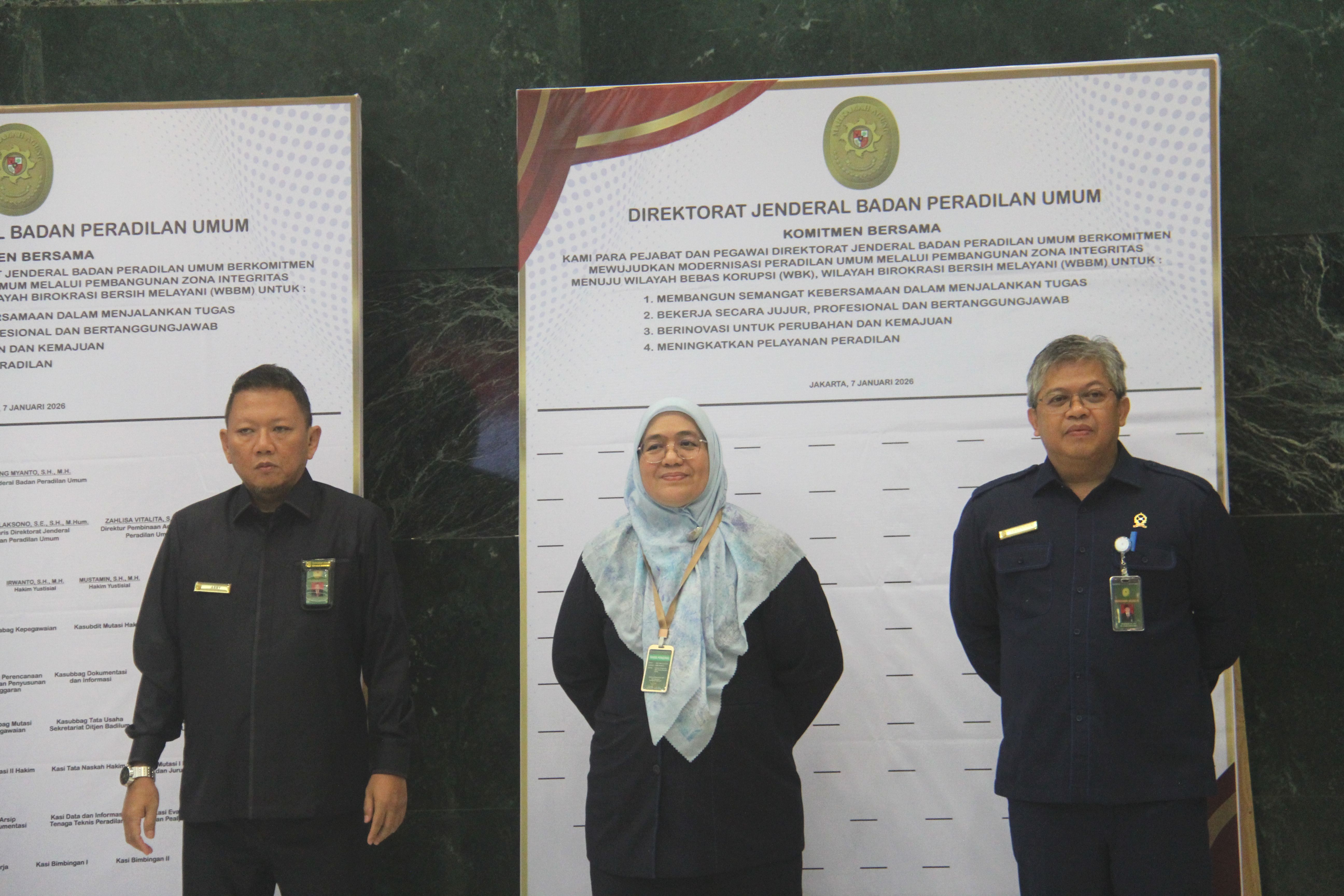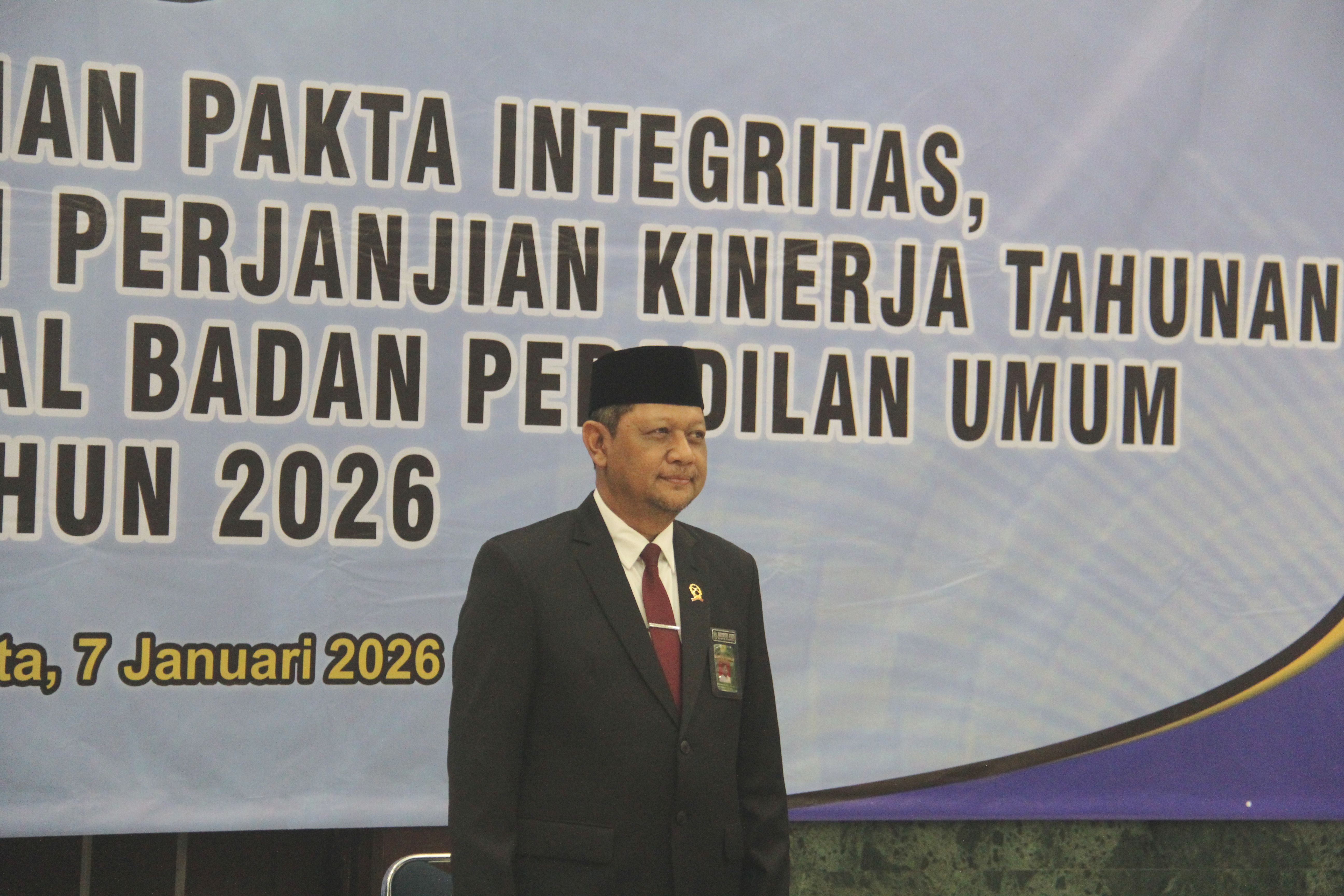 Direktur Jenderal Badan Peradilan Umum H. Bambang Myanto, S.H., M.H. dengan didampingi para pejabat tinggi pratama Direktorat Jenderal Badan Peradilan Umum., memimpin seluruh pejabat dan pegawai Ditjen Badilum dalam kegiatan penandatanganan Pakta Integritas dan Komitmen Bersama, yang menjadi awal pelaksanaan tugas di tahun 2026 Kegiatan ini berlangsung di Aula lantai 1, Gedung Sekretariat Mahkamah Agung RI, Cempaka Putih, Jakarta, pada hari Rabu, 07 Januari 2026.