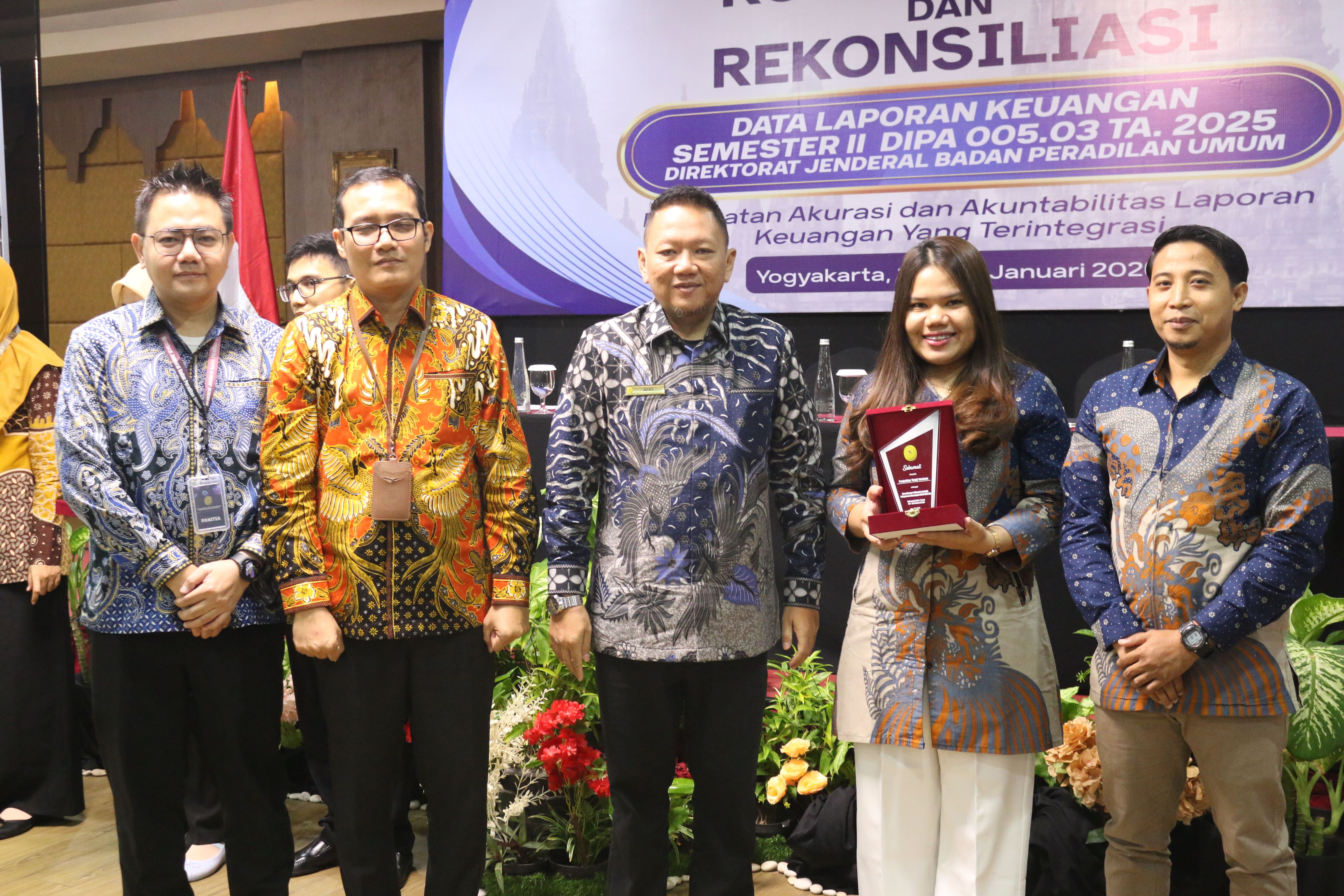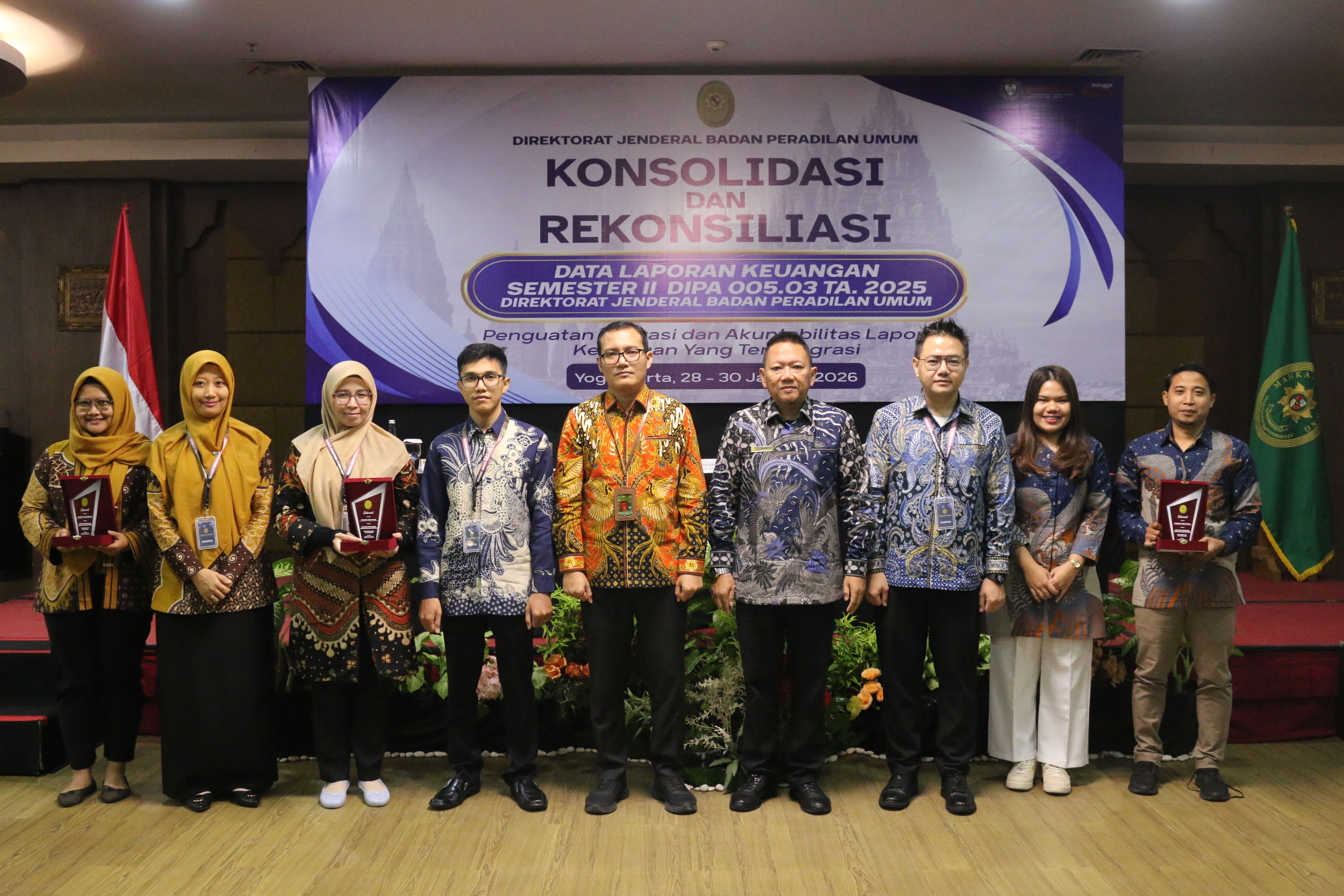 Pada kegiatan rekonsiliasi dan koordinasi data laporan keuangan lingkungan peradilan umum yang digelar pada Rabu-Jumat, 28-30 Januari 2026 di Yogyakarta, Sekretaris Ditjen Badilum, Kurnia Arry Soelaksono, S.E., S.H., M.Hum berikan penghargaan ke pengadilan tinggi yang menjadi sebagai koordinator laporan keuangan terbaik.