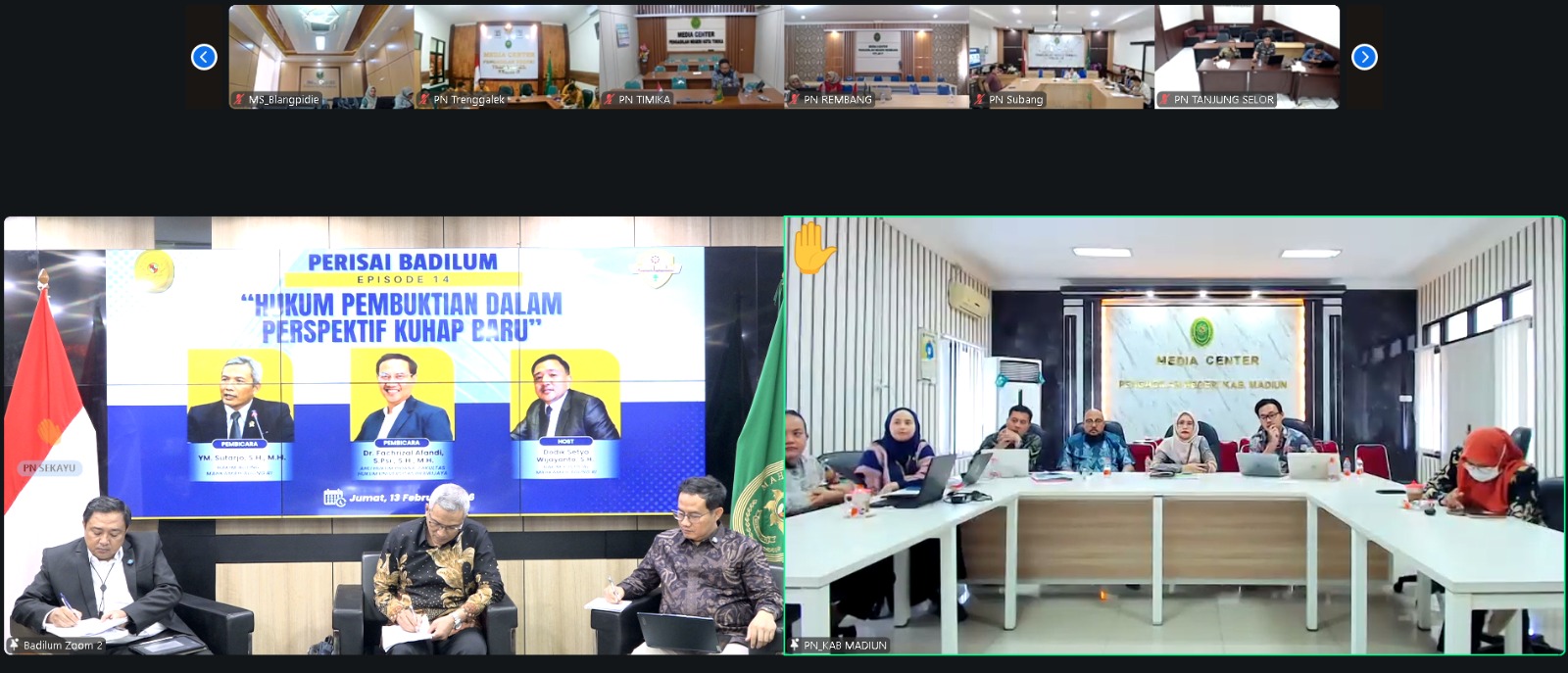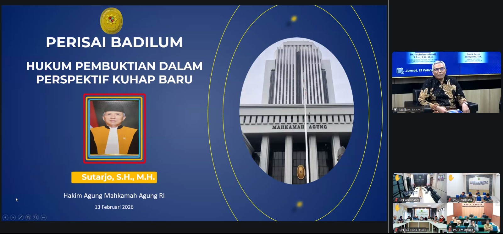 Masih dalam rangkaian sosialisasi terkait Kitab Undang-Undang Hukum Acara Pidana yang baru berlaku di tahun 2026 ini, Direktorat Jenderal Badan Peradilan Umum kembali menyelenggarakan Pertemuan Rutin Sarasehan Interaktif (PERISAI) episode ke-14 pada Jumat, 13 Februari 2026. Kegiatan dibuka oleh Direktur Jenderal Badan Peradilan Umum, H. Bambang Myanto, S.H., M.H., didampingi Direktur Pembinaan Tenaga Teknis Peradilan Umum, Hasanudin, S.H., M.H. PERISAI kali ini mengangkat tema "Hukum Pembuktian dalam PErspektif KUHAP Baru" dengan menghadirkan narasumber, yaitu Sutarjo, S.H., M.H., Hakim Agung pada Mahkamah Agung RI, dan Dr. Fachrizal Afandi, S.Psi., S.H., M.H. selaku Ahli Hukum Pidana dari Fakultas Hukum Universitas Brawijaya. PERISAI kali ini dihadiri, tidak hanya oleh satuan kerja di lingkungan peradilan umum, tetapi juga satuan kerja pada lingkungan peradilan militer dan pada Mahkamah Syari'ah secara daring.