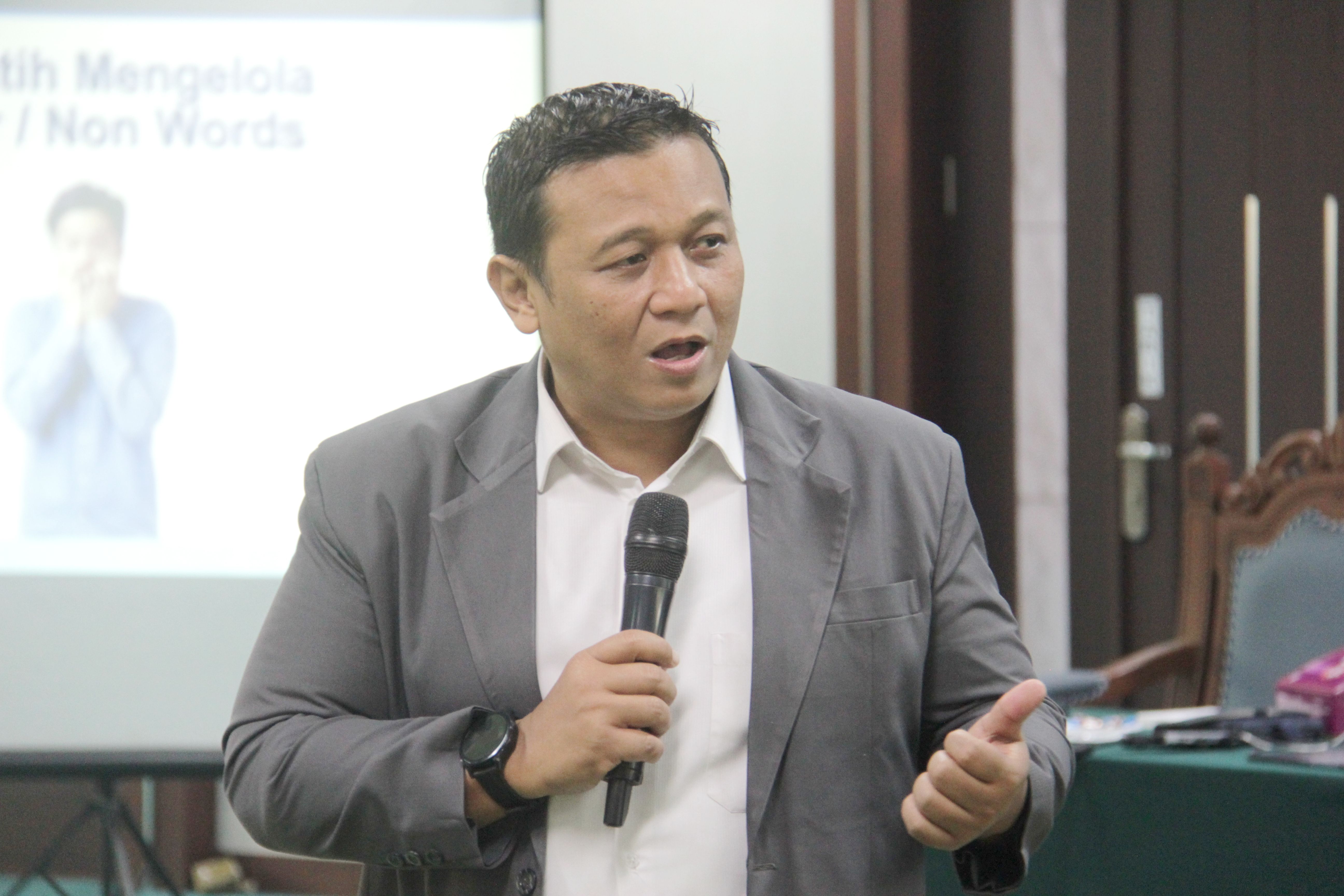 Materi tentang peningkatan kemampuan berbicara di depan publik dengan lebih percaya diri ini dibawakan oleh trainer dan fasilitator Ferry Aries Kurniawan. Pada kegiatan ini, para pejabat Ditjen Badilum tidak hanya menerima teori, namun langsung mempraktekan bagaimana berbicara dan menyampaikan informasi dengan baik di depan umum.