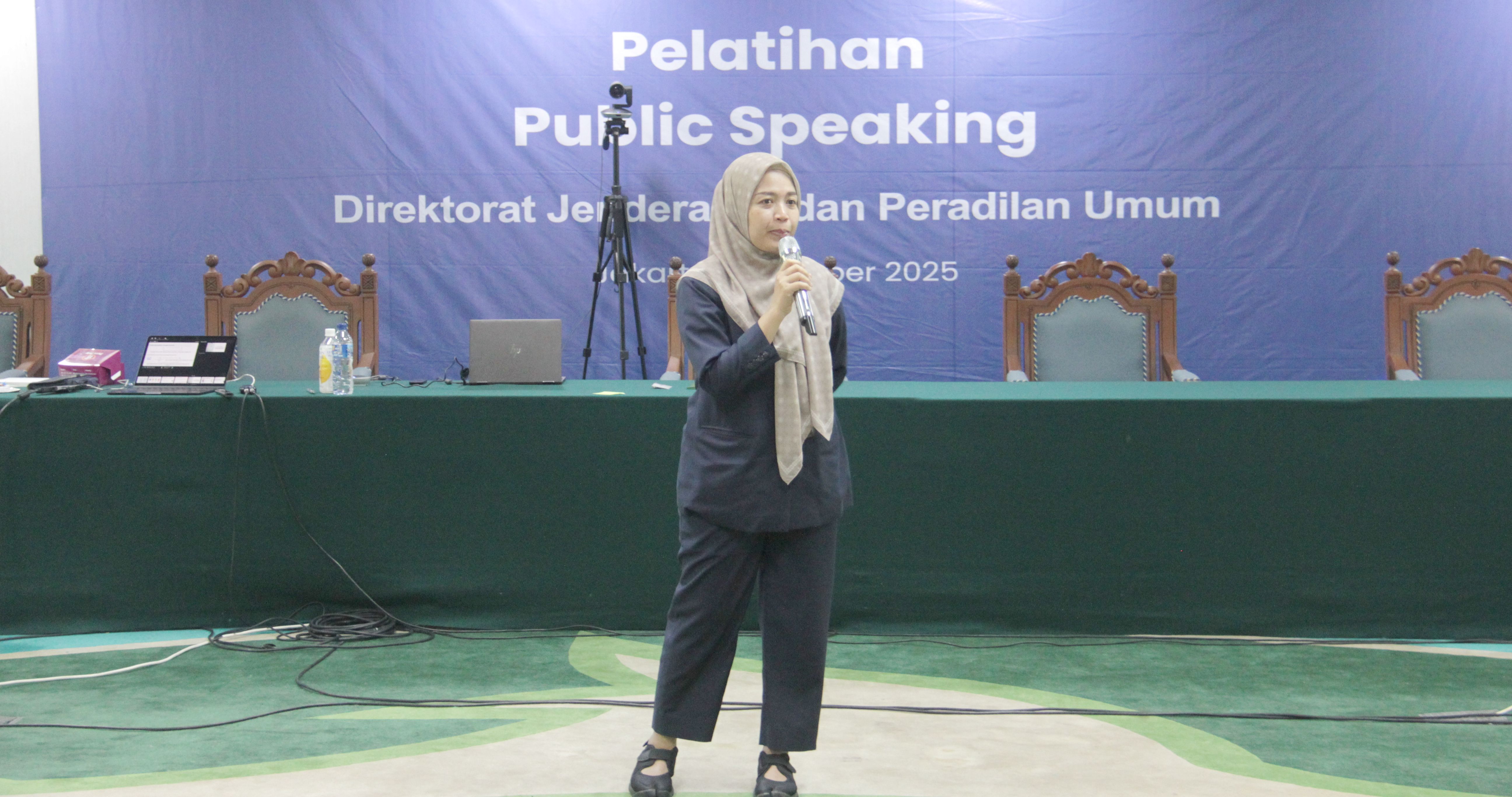 Untuk meningkatkan kemampuan komunikasi para pejabat struktural Ditjen Badilum, dilaksanakan kegiatan pelatihan public speaking yang bekerja sama dengan Bank Tabungan Negara (BTN). Pelatihan public speaking ini dibuka Sekretaris Ditjen Badilum, Kurnia Arry Soelaksono, S.E., S.H., M.Hum, Direktur Pembinaan Tenaga Teknis, Hasanudin, S.H., M.H, dan Eryc Albert dari BTN Kantor Cabang Kelapa Gading Square.