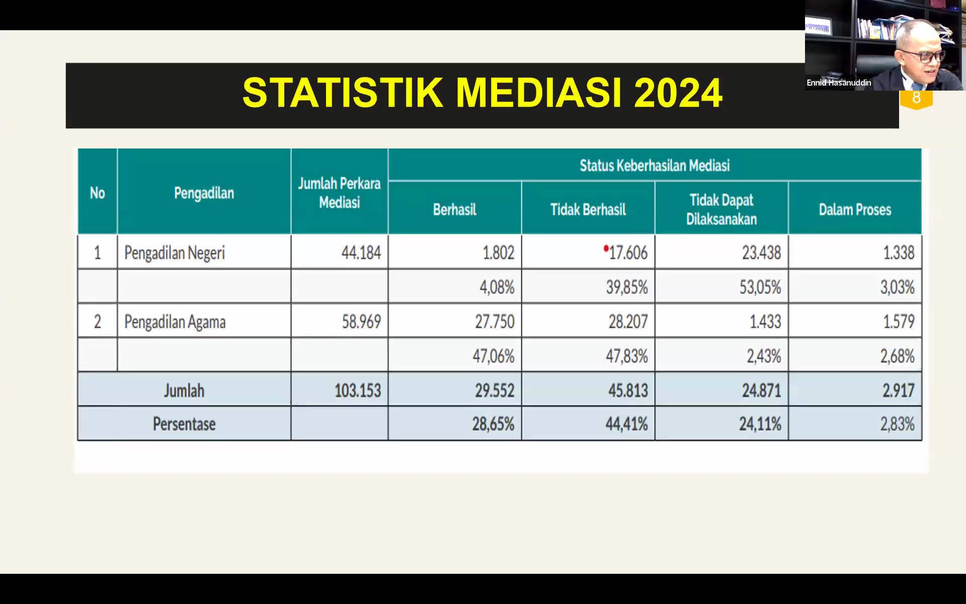Panitera Muda Perdata Mahkamah Agung RI Ennid Hasanuddin, S.H., C.N., M.H. selanjutnya membahas tata cara mediasi secara elektronik sesuai dengan peraturan yang telah ditetapkan Mahkamah Agung RI.