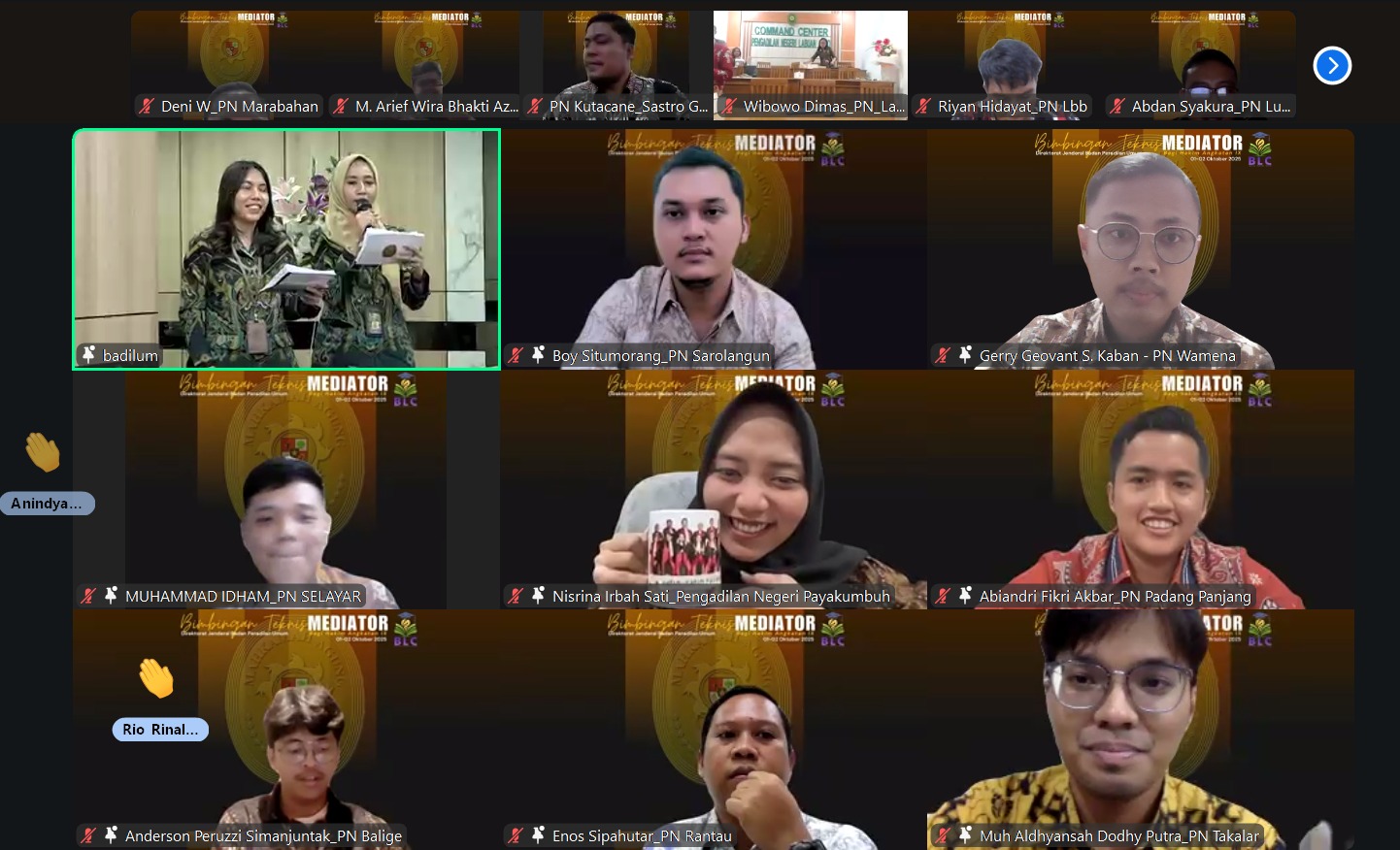 Direktur Jenderal Badan Peradilan Umum, H. Bambang Myanto, S.H., M.H. membuka kegiatan bimbingan teknis mediator yang diikuti oleh para hakim baru dari angkatan 9. Kegiatan yang dilaksanakan secara daring selama 2 hari pada 1 dan 2 Oktober 2025 ini bertujuan mengenalkan para hakim baru tentang proses mediasi, karena selain memutus perkara, para hakim juga bertugas menjadi mediator di pengadilan.
