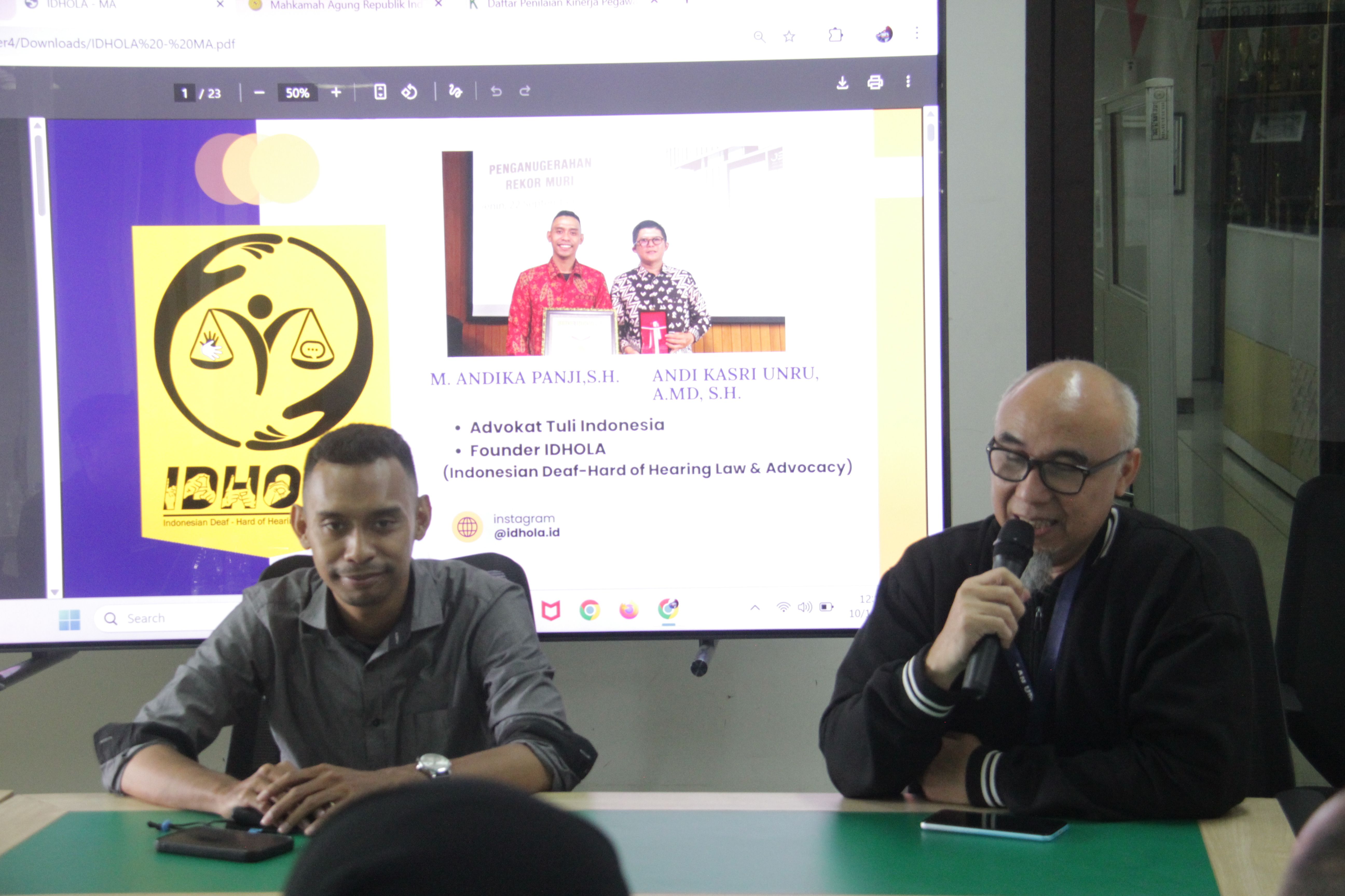 Narasumber yang hadir selain mengajarkan cara berkomunikasi juga menyampaikan etika dan cara bersikap jika ada penyandang diabilitas yang datang untuk mendapat layanan di PTSP. Setelah menerima materi, para petugas PTSP Ditjen Badilum mempraktikkan bagaimana cara berkomunikasi dengan penyandang disabilitas.