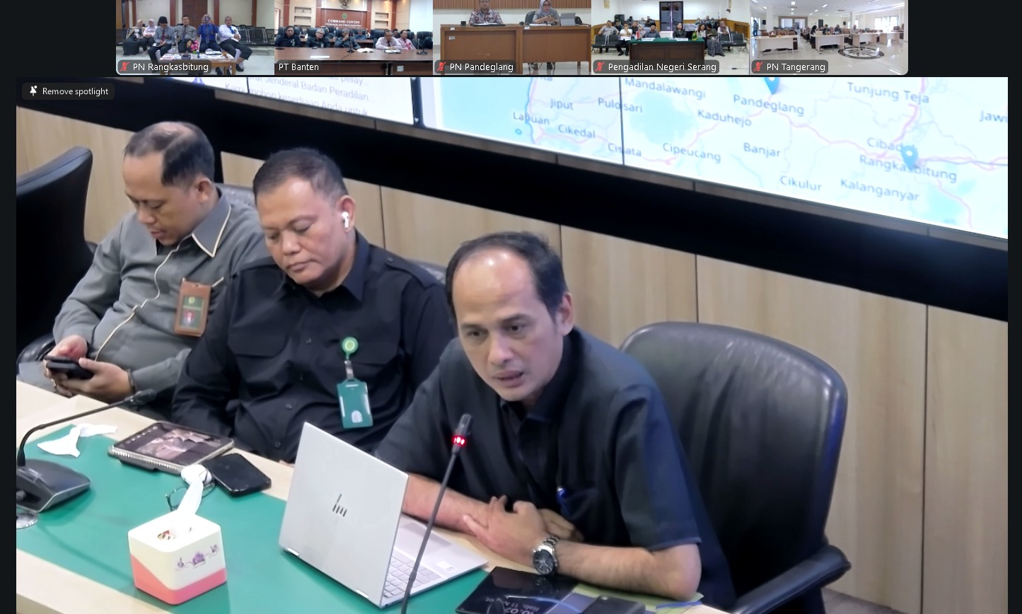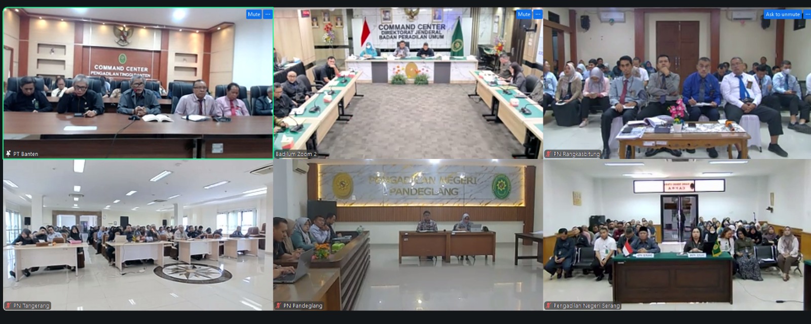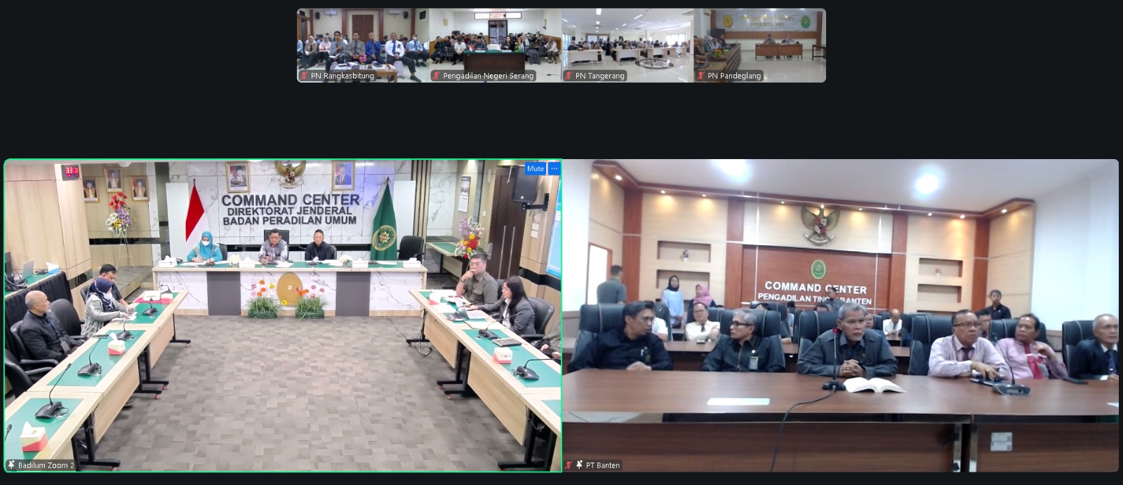 Demi meningkatkan peran pengawasan Pengadilan Tinggi terhadap satuan kerja di bawahnya dan dalam rangka pembinaan satuan kerja di lingkungan peradilan umum, Direktorat Jenderal Badan Peradilan Umum kembali melaksanakan program Sapa Pengadilan secara daring pada Rabu, 11 Maret 2026. Bertempat di Ruang Command Center Ditjen Badilum, Direktur Jenderal Badan Peradilan Umum, H. Bambang Myanto, S.H., M.H., didampingi para pejabat eselon II dan III menyapa Pengadilan Tinggi Banten beserta satuan kerja di bawahnya, yaitu: Pengadilan Negeri Serang, Pengadilan Negeri Tangerang, Pengadilan Negeri Rangkasbitung, dan Pengadilan Negeri Pandeglang. Pada kesempatan tersebut, Dirjen Badilum kembali mengingatkan pentingnya integritas dan memohon kepada Pengadilan Tinggi Banten untuk dapat meningkatkan pengawasan terhadap satuan kerja di bawahnya, serta menyampaikan kepada para aparatur peradilan untuk menghentikan segala layanan yang bersifat transaksional. Selain itu, pada kesempatan ini juga dibahas mengenai berbagai kendala yang dialami oleh setiap satuan kerja, baik terkait teknis pelaksanaan penyelesaian perkara, permasalahan sumber daya manusia, hingga sarana dan prasarana yang tersedia.