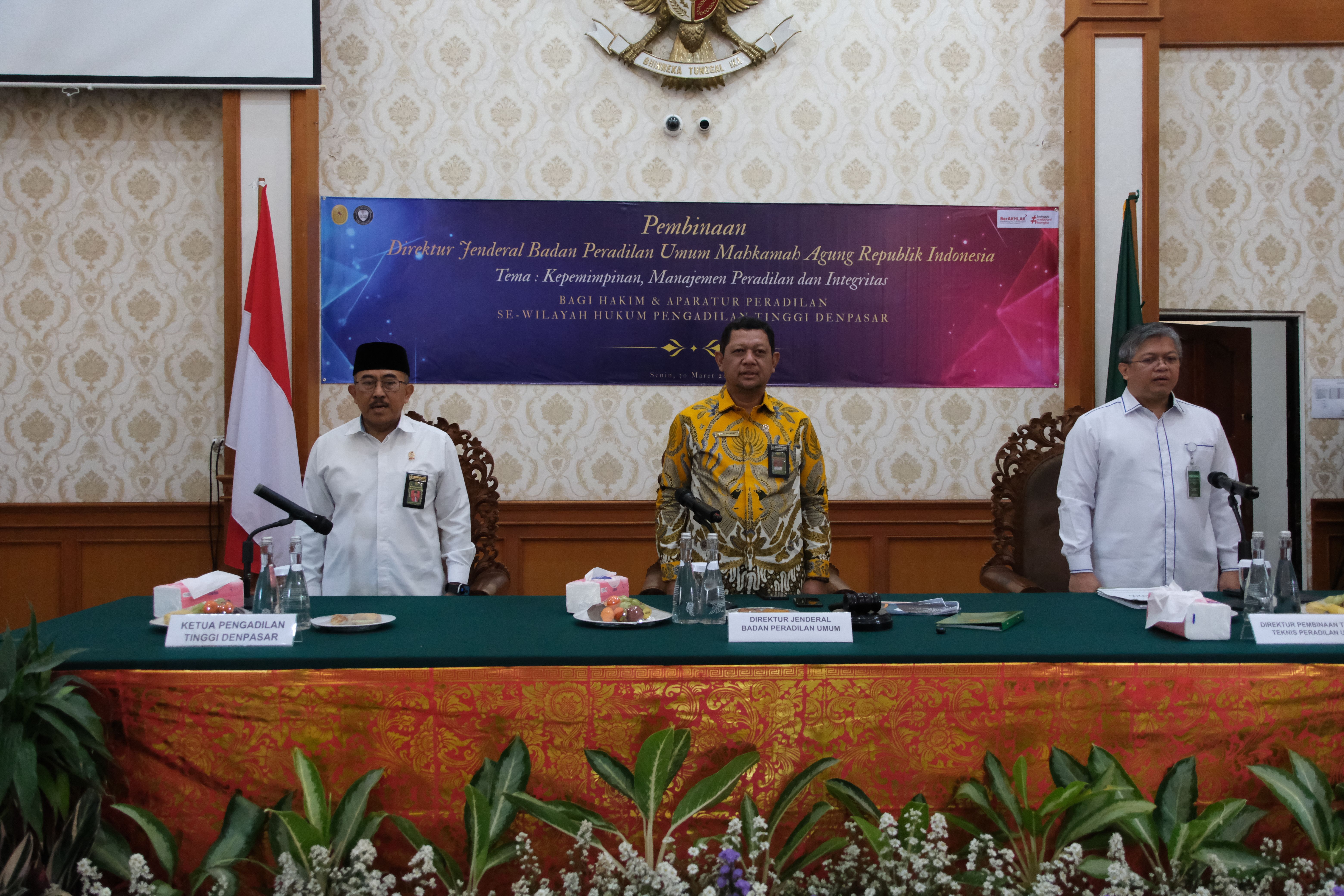 Kegiatan pembinaan DItjen Badilum ini diikuti para hakim tinggi pengawas daerah Pengadilan Tinggi Denpasar serta seluruh Ketua, Wakil Ketua, Sekretaris dan Panitera Pengadilan Negeri di Provinsi Bali. Ketua Pengadilan Tinggi Denpasar Bambang Heri Mulyono, S.H., M.H. memimpin jajarannya sekaligus memberikan sambutan. Beliau berpesan agar para aparat peradilan umum di Bali dapat meningkatkan integritas dalam pelayanan.